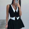 Women’s Fashion and Elegant Black and White Deep Plunge Neck Top and Pleated Skirt Two Piece Set