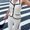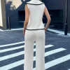 New Fashion Women’s Colorblocking Lapel Knit Vest Top and Knit Pants Two Piece Set