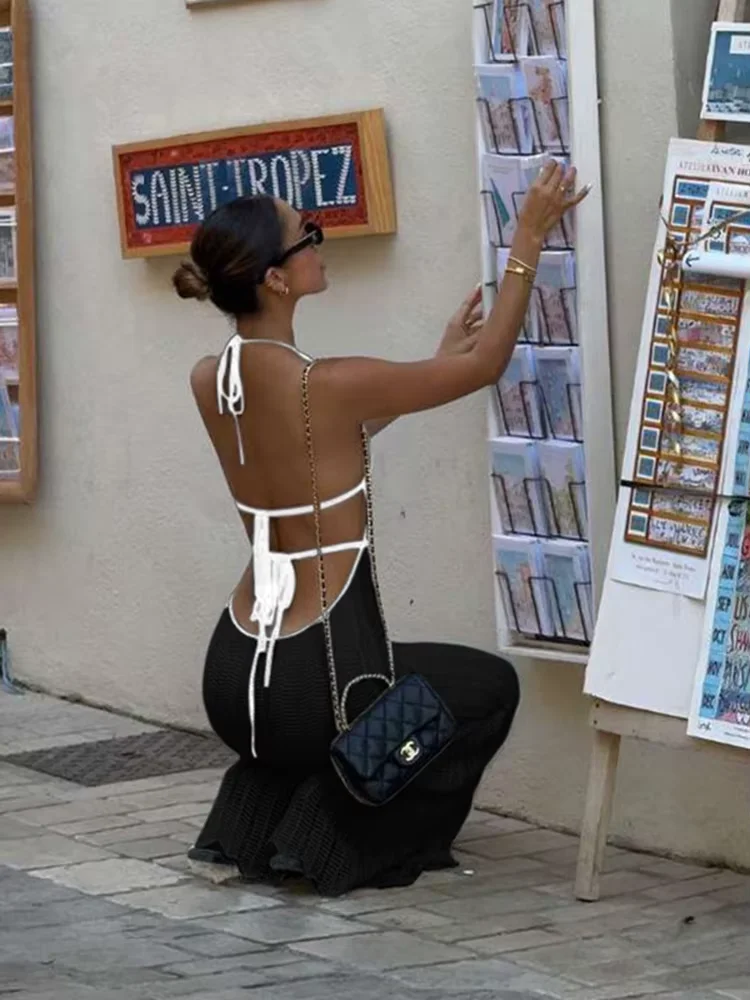 Sexy Knit Cut Out Two Piece Swimsuit Cover up 2025 Summer Women Waist Tie-Up Top Long Skirt Set Club Beach Dres