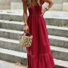 Women’s Summer Holiday Dress – Red Casual Vacation Wrap Dress, Solid Color, Comfortable Strapless Plunge Neck Elegant Long Dress